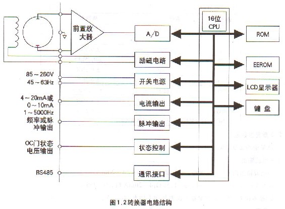 自來水電磁流量轉(zhuǎn)換器一方面向電磁流量傳感器勵磁線圈提供穩(wěn)定的勵磁電流,以達(dá)到B是個常量;同時把轉(zhuǎn)換器感應(yīng)的電動勢放大、轉(zhuǎn)換成標(biāo)準(zhǔn)的電流信號或頻率信號,便于流量的顯示、控制與調(diào)節(jié)。圖1.2所示為轉(zhuǎn)換器電路結(jié)構(gòu)。