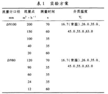 為實(shí)驗(yàn)介質(zhì),選取DN80mm和DN100mm的0.5級(jí)電磁流量計(jì),每個(gè)測(cè)試點(diǎn)測(cè)量3次,共180次測(cè)試,研究電磁流量計(jì)特征系數(shù)隨溫度變化的特性。具體實(shí)驗(yàn)方案見(jiàn)表1。