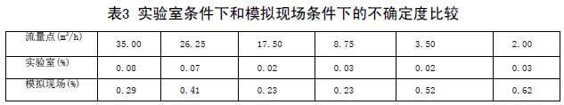 實驗室條件下和模擬現(xiàn)場條件下的不確定度比較(表3)兩次結(jié)果可以看出,兩次實驗各個流量點的不確定度差距非常大??梢?,水煤漿計量表對安裝條件還是比較苛刻的。