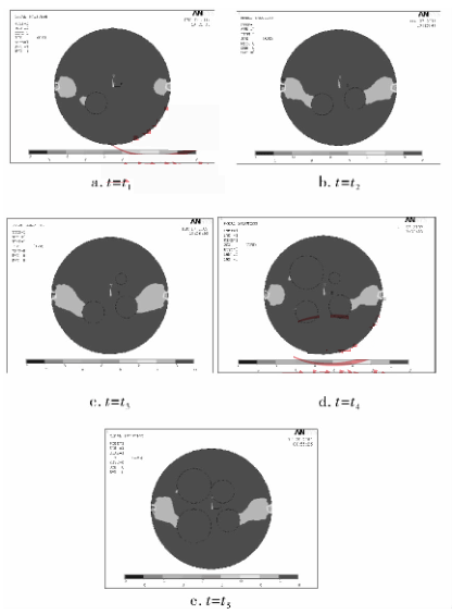 筆者探討在一體式電磁流量計(jì)徑向截面位置開始出現(xiàn)油氣泡時(shí)一體式電磁流量計(jì)感應(yīng)信號的響應(yīng)情況。在仿真模型中,設(shè)定這樣一個(gè)過程,在連續(xù)時(shí)刻 t 1 、t 2 、t 3 、t 4 ,流量計(jì)電*位置的徑向截面上分別開始出現(xiàn)一個(gè)油氣泡(非導(dǎo)電物質(zhì)),在 t 5 時(shí)刻出現(xiàn)的4 個(gè)油氣泡的半徑變大。在這一過程中,研究非導(dǎo)電物質(zhì)(油氣泡)的增加與變化對流量計(jì)輸出信號的影響情況;這一過程中,流體中的含水率也在變化,同時(shí)研究含水率對流量計(jì)的影響情況。圖 1 所示為流量計(jì)截面中油氣泡(非導(dǎo)電物質(zhì))增加與變化時(shí)的 Ansys 仿真圖,圖 1a ~ e 中分別顯示的是 t 1 ~ t 5 時(shí)刻虛電流 x 方向分量的 An-sys 圖。
