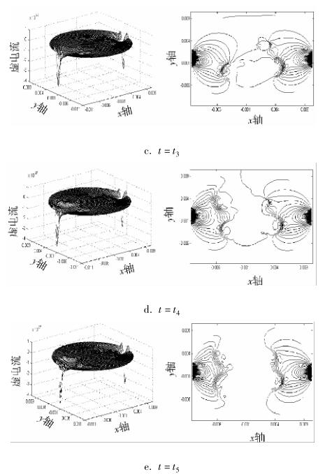 對 Ansys 仿真實(shí)驗(yàn)數(shù)據(jù)通過 Matlab 進(jìn)行結(jié)果分析。圖 2a ~ e 分別為 t 1 ~ t 5 時(shí)刻流體中存在油氣泡流量計(jì)測量區(qū)域虛電流在 x 方向上的分布圖及其等勢圖。從圖中可以看出:當(dāng)流體中油氣泡增加時(shí),流量計(jì)測量區(qū)域的敏感場發(fā)生變化,且流體中油氣泡越多,對流量計(jì)測量區(qū)域敏感場影響越大。為了更客觀地反應(yīng)這種現(xiàn)象,下面運(yùn)用敏感場靈敏度 c 進(jìn)一步進(jìn)行研究。