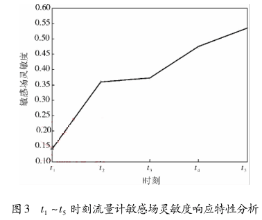 為了清晰地獲得以上 5 種情況下油氣泡對流量計(jì)虛電流分布的影響,運(yùn)用敏感場靈敏度來刻畫非導(dǎo)電物質(zhì)在不同情況下對流量計(jì)敏感場靈敏度的響應(yīng)特性。圖 3 所示為以上 5 種多個(gè)非導(dǎo)電物質(zhì)存在情況對流量計(jì)敏感場靈敏度響應(yīng)特性分析。從圖3中可以看出,隨著非導(dǎo)電物質(zhì)的個(gè)數(shù)在流體中的增加,流量計(jì)敏感場靈敏度也不斷增加,說明對一體式電磁流量計(jì)的輸出信號的影響也越大。圖 3 中 t 3 時(shí)刻敏感場靈敏度 c 較 t 2時(shí)刻增加較小,這是 t 3 時(shí)刻增加的油氣泡較小,而在 t 1 ~ t 5時(shí)刻增加的油氣泡較大時(shí),流量計(jì)敏感場靈敏度 c變化較大,說明流體中出現(xiàn)較大的油氣泡對流量計(jì)測量影響較大。