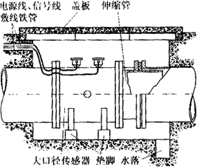 由于大口徑管道在多數(shù)場合下是埋在地下的,因此大口徑傳感器在安裝前應(yīng)做好水泥地坑。圖6-19所示是在給排水系統(tǒng)中常見的安裝形式。水泥地坑應(yīng)有足夠的活動空間,側(cè)壁埋有敷設(shè)電纜的鋼管,上有蓋板防止雨淋,下有泄水管以免坑內(nèi)積水而使傳感器侵水。為了拆裝方便,傳感器應(yīng)放在墊腳上,且在下游側(cè)裝有活絡(luò)的伸縮管。圖6-20是智能型防腐電磁流量計在地下水泥管污水排放系統(tǒng)中的安裝實(shí)例。