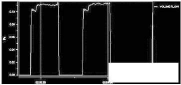 灌裝頭的*終出口部分為10~14mm的可更換縮口。通過縮口,可以產(chǎn)生背壓,一般縮口內(nèi)置蜂窩狀虹吸管,保證灌裝前后的管道滿管。從測試的流量波形上看,10mm的灌裝頭產(chǎn)生適當?shù)淖枘嵝Ч?,流量曲線較穩(wěn)定。
