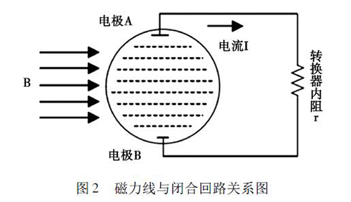 2. 1 正交干擾管道污水電磁流量計(jì)的磁路系統(tǒng)包含有兩個勵磁線圈,而導(dǎo)管內(nèi)的液體與傳感器電*及轉(zhuǎn)換器結(jié)構(gòu)組成了一個閉合的回路,如圖2 所示。理論情況下,磁力線( 圖中B) 應(yīng)與閉合回路相平行,但是由于裝配過程中的誤差,導(dǎo)致磁力線不可能完全平行于這一閉合回路,出現(xiàn)部分磁力線成一定角度穿過回路的現(xiàn)象,這引起了即使沒有液體流動的情況下,傳感器的電*上也會產(chǎn)生感應(yīng)電動勢,就形成了正交干擾的基本形式。