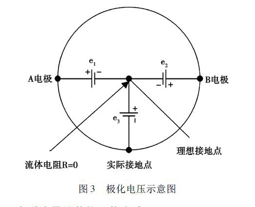 在被測液體與電*和接液部件接觸過程中,電解質(zhì)中的正負(fù)離子會分別作定向運(yùn)動,這會使被測液體在電*和接液部件之間形成電位差,通常將這種現(xiàn)象稱為*化現(xiàn)象。如圖3 所示,理論上來說,兩電*A 和B 對接液部件的電位e1、e2大小相等、方向相反,此時兩電*的電位差等于零。但是,若兩電*的材質(zhì)或表面狀態(tài)存在差異,此時A、B 電*之間的電位差就不為零,這就形成了*化電壓,*化電壓與共模狀態(tài)的電壓e3一起疊加在流量信號中,被輸入轉(zhuǎn)換器的差動放大器。當(dāng)*化電壓過大,則會對差動放大器的輸入端造成較大影響,導(dǎo)致信號無法放大或流量信號的輸出波動過大,從而降低了管道污水電磁流量計(jì)的測量精度。