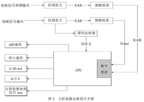 電*檢測出的微弱感應(yīng)電動勢E, 先經(jīng)前置放大器的放大和噪聲抑制而成為大幅度低阻抗的電壓信號。此信號經(jīng)相敏檢波后,給CPU 進行數(shù)字濾波、處理和控制,通過利用雙線性變換法將模擬的二階巴特沃斯低通濾波器轉(zhuǎn)換為數(shù)字式濾波器,既簡化電路設(shè)計,且可靠性高、穩(wěn)定性好。通過編寫軟件CPU 能對放大器的溫度漂移及零點漂移給予補償, 并在測量的全量程范圍內(nèi)分10 段對信號進行非線性修正,使得測量值更好地擬合真實數(shù)據(jù)??展軝z測電路上,CPU 作為從控制器。當主控制電路上發(fā)出空管檢測查詢信號wire, 從控制器進行識別后接收并判斷出查詢什么信號,然后產(chǎn)生應(yīng)答信號上傳至主控芯片輸出顯示;當檢測為空管信號時, 從CPU 發(fā)出的zero 信號通過控制MOS 管開關(guān)來關(guān)斷流速輸出。在應(yīng)用中,對于微弱信號的放大及提取還需注意PCB 板設(shè)計時EMI 電磁屏蔽考慮,屏蔽來自空間磁場的干擾、周邊設(shè)備的輻射造成的干擾和板內(nèi)之間的干擾,如數(shù)模分離、強弱電分離等等。