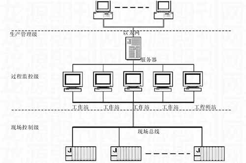 針對鎢礦選廠生產(chǎn)的實際需求,這里應用相應的自動化技術,對自動化監(jiān)控系統(tǒng)進行了設計。在系統(tǒng)設計中,遵循“方案合理、技術先進、運行可靠、操作方便”的原則,系統(tǒng)整體采用集散控制系統(tǒng),基于現(xiàn)場總線通訊,其整體網(wǎng)絡構架如下: