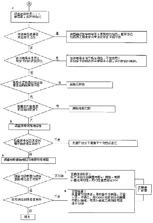檢查流程圖*5項(xiàng)。信號回路絕緣下降會(huì)形成零點(diǎn)不穩(wěn)。信號回路絕緣下降的土要原因足,包*部位絕緣下降所引起的,但也不能排除信號電纜及其接線端子絕緣下降或破壞。因?yàn)橛袝r(shí)候現(xiàn)場環(huán)境十分嚴(yán)酷,稍一疏忽儀表蓋、導(dǎo)線連接處密封不慎,彌漫著潮氣酸霧或粉粒塵埃侵入儀表接線盒或電纜保護(hù)層,使絕緣卜降。信號回路絕緣電阻檢查分別按電纜側(cè)和流量傳感器側(cè)兩郵分進(jìn)行,用兆歐表測試。因信號電纜容易可先做。流量傳感器再分兩次進(jìn)行:充滿液體測黽電*表面接觸電阻和個(gè)管后測量,U*絕緣電阻。