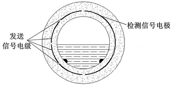 ①多電*式非滿管氯化鐵流量計。其底部是一對信號注人電*,中間有多對測量電*,頂端有一個滿管電*。在滿管情況下,該流量計與普通的氯化鐵流量計的功能相同,滿管情況下流體的橫截面積是固定的,此時計算流量值只需要測量流體的流速即可。當(dāng)流體非滿管時,滿管電*檢測到管道非滿狀態(tài),利用算法修正測量值,此時流量計的測量方式改成測量流體流速和液面高度。信號注人電*與在不同位置的三對測量電*共同工作,用于測量液位面的高度和流體的速度。多電*式非滿管氯化鐵流量計結(jié)構(gòu)簡圖如圖3所示。