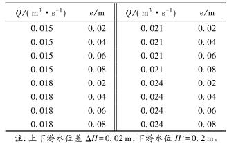 有限水域的浮體結(jié)構(gòu)在不同來流動水中運(yùn)行時(shí),浮體結(jié)構(gòu)位置的改變會對流場產(chǎn)生影響,從而影響浮體結(jié)構(gòu)的泄流能力以及穩(wěn)定性。試驗(yàn)過程中固定浮體結(jié)構(gòu)的體型不變(長L=0.20m,寬B=0.30m,高a=0.10m),分別選取4種不同來流流量Q及浮體結(jié)構(gòu)位置e,控制浮體結(jié)構(gòu)在上、下游水位不變的條件下進(jìn)行試驗(yàn),具體試驗(yàn)參數(shù)設(shè)計(jì)及說明見表1以及圖2。