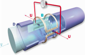 據電磁感應定律:導電流體在磁場中切割磁力線時,產生感應電動勢的大小為:U=BDV: