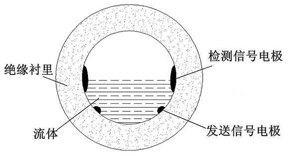 ③利用阻抗或信號衰減研制的非滿管化工原料流量計。這種結(jié)構(gòu)的非滿管化工原料流量計是當(dāng)前國內(nèi)研究的方向之一。其結(jié)構(gòu)是流量管底部貼一對信號發(fā)射電*,在流量管中間貼信號接收電*。由于信號在流體中傳播會產(chǎn)生衰減,且傳播時間越長,衰減越多,因此通過信號接收電*接收到的信號衰減量即可得知液面高度;同時該電*還能測量流體切割磁感線產(chǎn)生的電動勢,以此達(dá)到測量非滿管流量的目的。阻抗式或信號衰減非滿管化工原料流量計結(jié)構(gòu)簡圖如圖5所示。