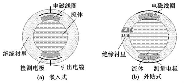 電*與被測流體通過絕緣管形成檢測電容,通過此電容來藕合流量信號。其主要的結(jié)構(gòu)形式按照電*的安裝位置可以分為兩種:電*嵌人測量管的絕緣襯里內(nèi)部(嵌人式)、電*貼在測量管外部(外貼式)。嵌入式結(jié)構(gòu)與普通化工原料流量計結(jié)構(gòu)相似,而外貼式大多是通過陶瓷表面金屬化技術(shù)將電*貼在測量管外。