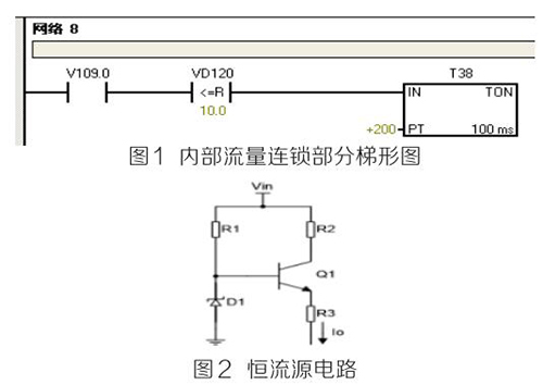 (2)PLC及模塊。PLC及模塊是自動(dòng)化控制系統(tǒng)主要設(shè)備,且PLC及模塊屬于高集成高精密電子設(shè)備,保持室內(nèi)整潔舒適,可以提高自動(dòng)化系統(tǒng)運(yùn)行穩(wěn)定性。PLC及模塊硬件運(yùn)行可靠,內(nèi)部控制程序是其控制核心軟件,如PLC硬件出現(xiàn)故障或損壞一般直接更換,但原內(nèi)部控制軟件無法上傳,整個(gè)控制系統(tǒng)成失控狀態(tài)。所以其內(nèi)部控制程序在調(diào)試驗(yàn)收合格后應(yīng)及時(shí)備份并做好標(biāo)記,為以后修復(fù)PLC故障提供保障。PLC系統(tǒng)的維護(hù)技術(shù)人員需掌握一定基礎(chǔ)PLC控制邏輯原理,對準(zhǔn)確判斷PLC故障點(diǎn)有很大的幫助。例如選礦廠水泵房S7-200系列PLC自動(dòng)抽水系統(tǒng)出現(xiàn)如下故障 :觸摸屏能控制變頻器啟動(dòng)水泵抽水,但在短時(shí)間內(nèi)會(huì)自動(dòng)停泵,導(dǎo)致無法正常抽水。通過故障現(xiàn)象可初步判斷PLC及模塊硬件設(shè)備正常,主要由于某個(gè)變量有問題導(dǎo)致連鎖停機(jī)。打開備份PLC控制梯形圖程序進(jìn)行相關(guān)分析,原來是排污流量計(jì)瞬時(shí)流量數(shù)值做了連鎖,其在一定時(shí)間內(nèi)瞬時(shí)流量不大于10m 3 /h時(shí),自動(dòng)停泵,電磁流量模擬量輸出電流值僅為4ma且無變化,確定排污流量計(jì)有故障??膳R時(shí)應(yīng)急維修,模擬量模塊輸入模擬電流值10ma~20ma之間一固定數(shù)值即可恢復(fù)正常運(yùn)行。制作簡單恒流源電路代替排污流量計(jì)輸出的模擬電流量,實(shí)現(xiàn)解決水泵無法正常運(yùn)行的故障。