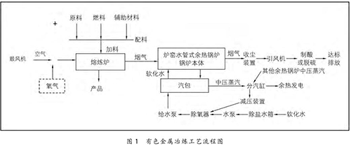 在有色金屬冶煉過程中,將原料、燃料和輔助材料根據(jù)熱平衡原理按一定比例進行配料,配料后的物料與空氣或高含氧的混合空氣在熔煉爐中進行氧化或還原反應(yīng),熔煉出有色金屬產(chǎn)品。同時,在熔煉過程中會產(chǎn)生大量的高溫?zé)煔猓?1200 ℃ 左右),高溫?zé)煔饨?jīng)過余熱鍋爐時,與余熱鍋爐水側(cè)的軟化水進行熱量交換,煙溫迅速降至 250℃ 以下,再經(jīng)收塵、制酸或脫硫裝置進一步收塵、降溫、凈化,*終達標排放。余熱鍋爐水側(cè)的軟化水經(jīng)熱量交換后產(chǎn)生中壓飽和蒸汽(4 MPa 左右),送至余熱發(fā)電機組發(fā)電。具體的工藝流程如圖 1 所示。