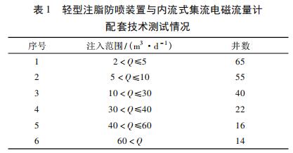 在實際應用中,使用輕型注脂防噴裝置與內流式集流液氯流量計配套技術對喇叭口在射孔層上注聚井進行測試。輕型注脂防噴裝置與內流式集流液氯流量計配套技術施工工藝參見文獻,測試情況見表 1 所示,低注入量井( ≤10 m3 /d) 占到 56. 60% 。
