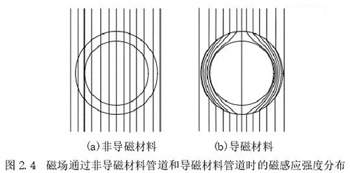 1.測量管:主要是傳感器的管道,該管道由高導(dǎo)電率非導(dǎo)磁材料制成,可保證流體在通過時(shí)能夠表現(xiàn)出自身的電磁效應(yīng),在該管道內(nèi)中安裝了內(nèi)襯。使用非導(dǎo)磁材料的原因是保證勵(lì)磁線圈中所產(chǎn)生的磁場不會順著管道流走,確保測量管道內(nèi)部產(chǎn)生明顯的磁感應(yīng)線,下圖 2.4 中展示了利用非導(dǎo)磁材料和導(dǎo)磁材料管道中所產(chǎn)生磁感應(yīng)線的情況。