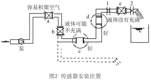 液體流動方向必須與傳感器殼體上箭頭方向一致。對于能正反向測量的廢水流量表,若方向不一致雖仍可測量,但設定的顯示流動正反方向不符,必須改正之。若拆傳感器工作量大,也可改變傳感器上箭頭方向和重新設定顯示儀表符號。管道未充滿液體主要是管網(wǎng)工程設計或傳感器安裝位置不妥,使傳感器測量管內(nèi)不能充滿液體。應采取措施,避免安裝如圖2所示a,e位置和以虛線管排放時b位置,改裝到c,d位置。