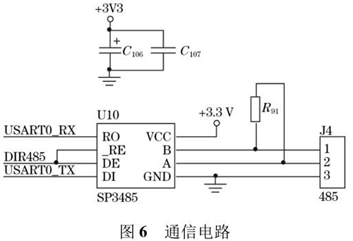 電鍍廢水流量表輸出的流量值可以通過外接的 TFTLCD 屏直接顯示,還可以通過預(yù)留的 RS485 通信接口將數(shù)據(jù)發(fā)送到上位機(jī)中。RS485 電路*大的優(yōu)點是 485 電平與 TTL 電平兼容,方便與 TTL 電路相連;抗共模干擾能力強;數(shù)據(jù)傳輸速度快,高達(dá) 10 Mbps;通信距離遠(yuǎn),*大為 1.2 km。系統(tǒng)采用 SP3485 芯片進(jìn)行數(shù)據(jù)通信,SP3485 是一款低功耗芯片且符合RS485 協(xié)議的收發(fā)器,電路圖如圖 6 所示。