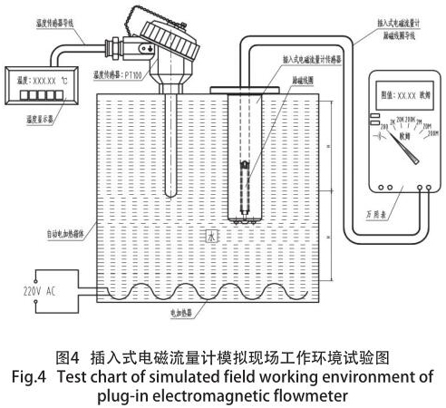 其原因是:勵磁線圈的阻值及匝數(shù)是按照常溫狀態(tài)下進行設(shè)計的,而含有勵磁線圈的鹽酸流量表經(jīng)常是高于常溫狀態(tài)下進行安裝、使用(如:高爐回水、供熱管道等),勵磁線圈的阻值隨使用環(huán)境溫度的變化而變化,致使鹽酸流量表測量時的準(zhǔn)確度大為降低,性能的不確定性大為增加,為了保證儀表的高準(zhǔn)確度和穩(wěn)定性,在不同的季節(jié)(主要是環(huán)境溫度和介質(zhì)溫度),經(jīng)過大量模擬現(xiàn)場實際情況的試驗,并結(jié)合轉(zhuǎn)換器的技術(shù)參數(shù)要求,得出一個完善的勵磁線圈各種技術(shù)參數(shù)。模擬現(xiàn)場試驗裝置如圖 4 所示。