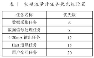 下面以電磁流量計為例說明基于 μC/OS-III 的人機界面設(shè)計。 先將 μC/OS-III 移植到 Cortex-M3 處理器上,這里選用的是 STM32F103VET6 。電磁流量計的應(yīng)用程序若按照上節(jié)的任務(wù)種類劃分有: 數(shù)據(jù)采集任務(wù)、數(shù)據(jù)處理任務(wù), 4~20mA輸出任務(wù), Hart 通訊任務(wù)以及用戶交互任務(wù)。 先對不同的任務(wù)進(jìn)行優(yōu)先級的劃分,如表 1 所示。