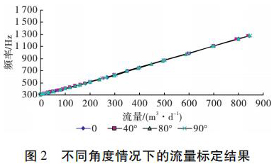 為了考察井眼斜度變化對原水流量計測量流量的影響,開展了非集流原水流量計在不同斜度情況下的流量測量模擬實驗。模擬實驗在大慶油田多相流實驗室進行,儀器外徑 38 mm,模擬井筒內(nèi)徑為 124 mm,實驗介質(zhì)是水,傾斜角度分別為 0°、40°、80°和 90°( 水平) ,流量范圍為 5 ~ 850 m3 /d。實驗結(jié)果表明,在儀器居中條件下,井眼斜度變化對原水流量計的儀表常數(shù)沒有影響,滿量程誤差不大于 4% ,因此可以應(yīng)用原水流量計進行水平井注水剖面測量。不同角度情況下的實驗結(jié)果如圖 2 所示。