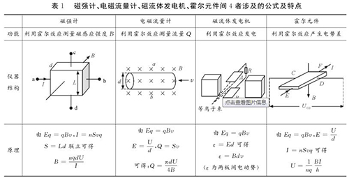 易錯點2:磁強計、分體式電磁流量計、磁流體發(fā)電機、霍爾元件間的區(qū)別與聯(lián)系磁強計、分體式電磁流量計、磁流體發(fā)電機、霍爾元件都是利用電磁場對帶電粒子的偏轉(zhuǎn)效應(yīng),并且穩(wěn)定時電場力與磁場力均達(dá)到平衡。很多學(xué)生容易將其混淆,遇到問題常常搞不清原理,亂代公式,筆者特將4者涉及的公式及特點等做一對比區(qū)別如表1所示。