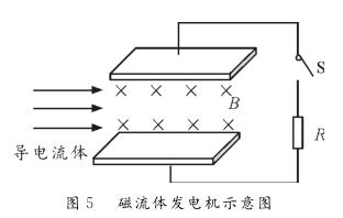 【例1】圖5為磁流體發(fā)電機示意圖。設(shè)兩金屬板間的距離為d,兩*板間勻強磁場的磁感應(yīng)強度為B。等離子體垂直進(jìn)入磁場的速度為v,單個離子所帶的電荷量為q。離子通道(即兩*板內(nèi)所圍成的空間)的等效電阻為r,負(fù)載電阻為R。則下列判斷正確的是( ?。?br/>A。該發(fā)電機的電動勢E=Bdv