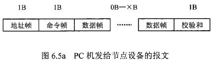 在紙漿流量計(jì)等節(jié)點(diǎn)設(shè)備和C機(jī)通信的過程中,由地址幀、命令幀、數(shù)據(jù)幀、校驗(yàn)和可組成各種功能不同的報(bào)文。由于采用主從工作方式來實(shí)現(xiàn)通信,紙漿流量計(jì)等節(jié)點(diǎn)設(shè)備僅能接收并執(zhí)行PC機(jī)發(fā)送來的控制命令,而不能發(fā)送命令給PC機(jī)。因此,由PC機(jī)發(fā)往流量計(jì)等節(jié)點(diǎn)設(shè)備的報(bào)文一般包括一個(gè)地址幀,一個(gè)命令幀,若干個(gè)數(shù)據(jù)幀和一個(gè)校驗(yàn)和,其報(bào)文格式圖.6a5所示;而由流量計(jì)等節(jié)點(diǎn)設(shè)備發(fā)往PC機(jī)的報(bào)文一般包括一個(gè)地址幀,若干個(gè)數(shù)據(jù)幀和一個(gè)校驗(yàn)和,其報(bào)文格式如圖6.5b所示。