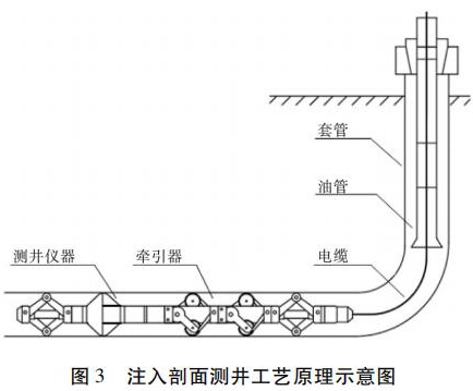 水平井注水井注入剖面測井工藝原理如圖 3 所示。在垂直井段,儀器在重力作用下可以通過注入管柱下入到井內(nèi),注入管柱下端須裝有喇叭口,且喇叭口應(yīng)在造斜點(diǎn)以上,保證測井完成后儀器順利起出,不發(fā)生卡儀器問題。儀器通過喇叭口以后在重力作用下繼續(xù)向下移動(dòng),當(dāng)儀器不能靠重力下移時(shí),啟動(dòng)牽引器,利用牽引器將儀器推送到井底,上提電纜過程中進(jìn)行測井。