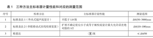 本規(guī)范包含三種校準(zhǔn)方法,分別為標(biāo)準(zhǔn)表法 1(外夾式超聲流量計)、標(biāo)準(zhǔn)表法 2(串聯(lián)移動式在線校準(zhǔn)裝置)和稱重法,編制組對每種方法進(jìn)行了大量的實(shí)驗(yàn),并積*與JKM-LDE電磁流量計生產(chǎn)廠家及用戶溝通探討,積累了豐富的經(jīng)驗(yàn),獲得了大量的實(shí)驗(yàn)數(shù)據(jù),*終確定三種方法的主標(biāo)準(zhǔn)器計量性能和對應(yīng)的測量范圍,如表 1 所示。