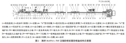 如圖 2 所示,DLFP14 - 70T 注脂防噴盒有 1 個(gè)注脂口、1 個(gè)回脂口、1 個(gè)防噴盒液控口、1 個(gè)刮纜器液控口及1 個(gè)溢流口,主體內(nèi)裝有 6 根阻流管。DLFP14 - 70T 注脂防噴盒采用 4 級(jí)密封: * 1 級(jí)密封采用注脂密封,撬裝注脂泵從注脂口注入高壓高粘度密封脂于 6 根阻流管與電纜間隙; * 2 級(jí)密封采用液壓密封,氣動(dòng)液壓泵主加壓和手壓泵補(bǔ)加壓結(jié)合從防噴盒液控口注入液壓油,推動(dòng)活塞擠壓膠芯壓筒; * 3 級(jí)密封采用液壓密封,手壓泵加壓從刮纜器液控口注入液壓油,推動(dòng)活塞擠壓膠芯壓筒實(shí)現(xiàn)密封和刮油作用; * 4 級(jí)密封油杯、橡膠盤(pán)根和刮油環(huán)( 鋼 墊) 。DLFP14 - 70T 注脂防噴裝置配有液控上、下捕捉器、液控雙閘板防噴器和放噴組件,根據(jù)實(shí)際可以調(diào)整溢流量,實(shí)現(xiàn)零溢流密閉測(cè)井施工。 DLFP14 - 70T 注脂防噴裝置工作壓力 70 MPa,耐壓105 MPa。