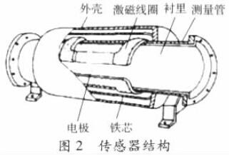 電磁流量計(jì)由流量傳感器和轉(zhuǎn)換器兩部分組成。傳感器典型結(jié)構(gòu)示意如圖2,測(cè)量管上下裝有激磁線圈,通激磁電流后產(chǎn)生磁場(chǎng)穿過測(cè)量管,一對(duì)電*裝在測(cè)量管內(nèi)壁與液體相接觸,引出感應(yīng)電勢(shì),送到轉(zhuǎn)換器。激磁電流則由轉(zhuǎn)換器提供。