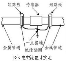 (4)盡量避開(kāi)振動(dòng)源、磁源(大功率電機(jī)、變壓器)由于管道水流量表的測(cè)量感應(yīng)電壓很小,電壓較低,易受外界電磁噪聲的影響,故在安裝時(shí)應(yīng)進(jìn)行可靠的接地連(跨)接。金屬管道管道水流量表接地連(跨)接方法如圖3所示