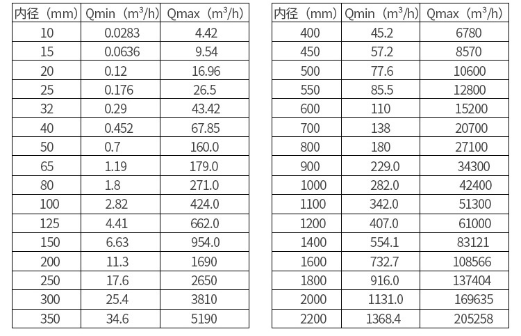 *小與*大流量對應的流速為0.1~10m/s
