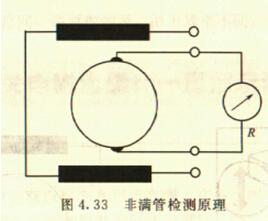 非滿(mǎn)管檢測(cè)也是基于電導(dǎo)率檢側(cè)的方法。在圖4.33所示的電磁流量傳感器中,增加了一個(gè)(或一對(duì))非滿(mǎn)管檢測(cè)電*。當(dāng)導(dǎo)管內(nèi)液體滿(mǎn)管時(shí),頂部電*與其他電*之間的電阻值很小;而當(dāng)存在非滿(mǎn)管情況時(shí),頂部電*與導(dǎo)電液體之間有氣體阻隔,所以電*電阻顯著增大,從而做出非滿(mǎn)管判斷。