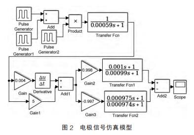 電*上的感應電動勢在沒有經(jīng)過放大之前一般很小, 取值在幾毫伏到幾百毫伏之內(nèi),本次仿真中流速感應電勢取 10mV。放大器的輸入電阻遠遠大于內(nèi)阻,文獻中給出電荷傳遞電阻為 Rs=50Ω。 電*接觸電阻與溶液電導率有關一般取 Rt=15kΩ。雙電 層 電 容 C1=20μF。 將各參數(shù)值代入到式(7)中,可得 k1=0.998,T1=0.001,T=9.9×10-4。 理想情況兩個電*參數(shù)取值相等, 實際中兩者會存在差異對于電* B 可 取 K1=0.997,T1=9.75×10-4,T2=9.74×10-4。