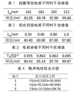 仿真試驗中,設定線圈等效電感取值范圍為 162~212mH,間隔 10mH;閉合回路等效電感范圍 0.2~1mH,間隔為 0.2mH;雙電層電容、接觸電阻隨流體電導率變化而變化,電導率增大接觸電阻和雙電層電容減小而電荷傳遞電阻增大。可設定電*接觸電阻、雙電層電容和電荷傳遞電阻范圍分別為 5~15kΩ、10~20μF 和50~60Ω,由公式(7)知,可用 T2 表示上述三者關系。 仿真參數(shù)取值不同情況下,通過 MATLAB 工具箱對仿真測量得到的干擾峰值進行曲線擬合畫出相應的曲線圖。 其中仿真數(shù)據(jù)和相對應的曲線方程如表 1~表 4 所示,曲線圖如圖 4~圖 6。