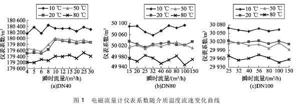 將實驗測得的粘土漿流量計在不同溫度及流速下的儀表系數(shù)數(shù)據(jù)整理,特性曲線如圖1所示,3組曲線分別對應(yīng)DN40、DN80、DN100的3塊粘土漿流量計的儀表系數(shù)曲線。
