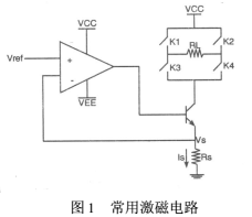 以往的激磁電路的設(shè)計(jì)都是采用恒流源和可控開關(guān)電路組成。恒流源是由電壓基準(zhǔn)、比較放大、控制調(diào)整和采樣等部分組成的直流負(fù)反饋?zhàn)詣?dòng)調(diào)節(jié)系統(tǒng),常用的激磁電路就是用串聯(lián)調(diào)整型恒流電源盒控制開關(guān)組成的,如圖1。其中Vref是參考電壓,Rs是采樣電阻,Is為流過(guò)Rs的電流,就是所需的恒流,RL為電磁流量傳感器線圈,K1、K2、K3、K4為可控開關(guān),以達(dá)到使線圈RL中流經(jīng)正負(fù)交換的電流,對(duì)傳感器激磁。