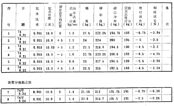 測試方法:將氨水通過流量計(jì)計(jì)量后,放入氨水桶,用磅秤稱其重量,以磅秤示數(shù)為標(biāo)準(zhǔn),求氨水流量計(jì)之誤差?,F(xiàn)將幾次典型實(shí)測數(shù)據(jù)列表于后: