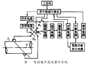 智能超聲波流量計的系統(tǒng)結構如圖2所示。其工作過程是:在上位機的控制下,單片機先對計數(shù)器清零,使開關K1閉合,K2合向下邊,然后控制同步電路發(fā)出同步啟動脈沖,觸發(fā)超聲波換能器T1發(fā)射*1個超聲脈沖波,同時使計數(shù)電路開始對周期為f的高頻方波進行計數(shù)。該超聲脈沖順流傳播,至T2處被接收并轉換成電信號,經(jīng)過放大、整型,一部分返回代替同步信號觸發(fā)T1再次發(fā)射超聲波,如此反復形成順流發(fā)射聲循環(huán),另一部分進入分頻電路進行分頻。當聲循環(huán)M次,分頻器滿并產(chǎn)生一信號,關斷高頻方波,使計數(shù)停止計數(shù)。同時單片機斷開K1停止聲循環(huán),讀取鎖存器中的順流發(fā)射聲循環(huán)計數(shù)值N1。然后單片機再對計數(shù)器清零,再使開關K1閉合,K2 合向上邊,觸發(fā)換能器T2 發(fā)射。此次,T2 發(fā)射T1接收,形成逆流發(fā)射聲循環(huán),同樣可得到逆流發(fā)射聲循環(huán)計數(shù)值N2。當聲循環(huán)次數(shù)M足夠大,由于統(tǒng)計作用,上述2次聲循環(huán)的固有電聲延遲 (包括超聲波經(jīng)過換能器透聲斜楔、管圖2智能超聲波流量計系統(tǒng)壁等所需的時間以及電信號滯后的時間)之和是相等的,于是當f已知且固定不變時,根據(jù)上述公式可將2個計數(shù)值之差 (N2 -N1)換算成流體流速V和流量Q。