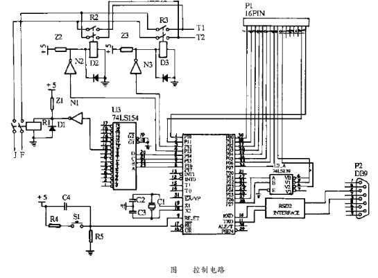 圖中單片機89C5 1和譯碼器74LS139構成計數(shù)板上鎖存器的片選信號,通過片選信號和P0口讀入計數(shù)值;單片機89C5 1、譯碼器74LS15 4和繼電器D1可切換檢測多個定子線棒支路間的超聲信號;繼電器D2和D3等完成一組超聲換能器收發(fā)功能的互換;單片機RXD和TXD引腳經(jīng)RS - 2 32電平變換,完成同上位機的通訊任務。