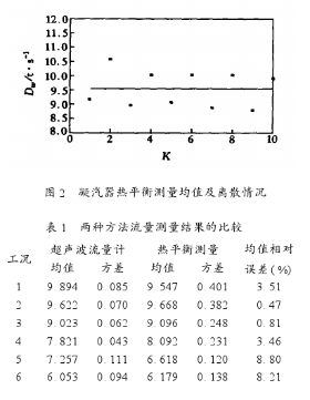 (1)采用超聲波流量計測量凝汽器冷卻水流量時,測量數(shù)據(jù)的離散度較小,而采用凝汽器熱平衡測量得到冷卻水流量的離散度較大,因此,超聲波流量計測量的精確度較高。
